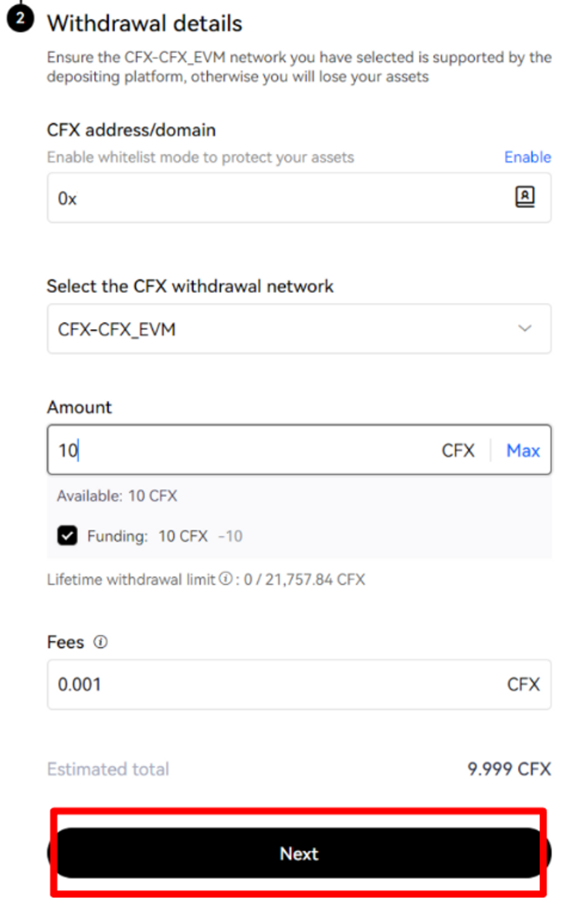 7. Review the transaction details, including the withdrawal fee, and click "Next" to initiate the transfer.