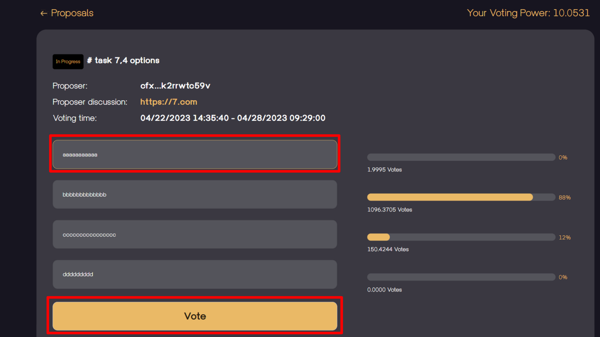 **Step 2:** Once the proposal is selected, choose the option you want to support. Then, select the "Vote" button.